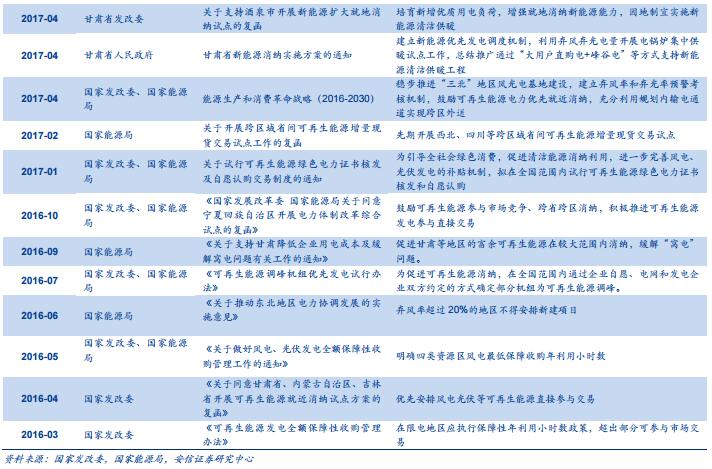 其中,2016 年 3 月 24 日,國家發(fā)改委發(fā)布《可再生能源發(fā)電全額保障性收購管理辦法》,規(guī)定在限電地區(qū)應執(zhí)行保障性年利用小時數政策,超出部分可參與市場交易?;痣姅D占消納空間導致的可再生能源未達到保障小時數的部分,將由火電企業(yè)進行補償。