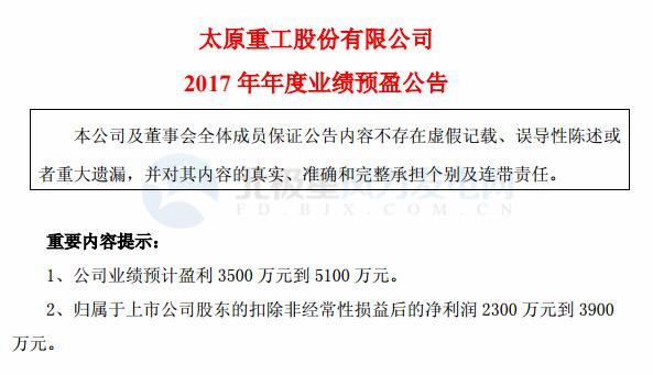 太原重工預計2017年業(yè)績盈利3500 萬元到 5100 萬元,歸屬于上市公司股東的扣除非經(jīng)常性損益后的凈利潤 2300 萬元到 3900 萬元。