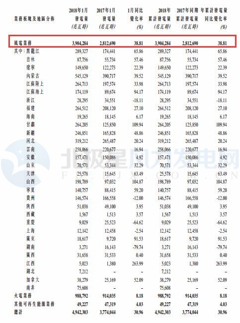 龍?jiān)措娏?018年1月總發(fā)電量49.42億千瓦時(shí),同比增長30.96%,其中風(fēng)電發(fā)電量39.04億千瓦時(shí),同比增長38.81%。