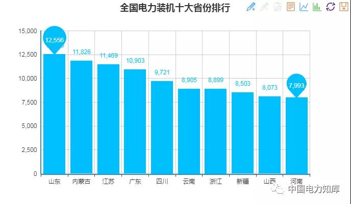 截止2017年底,全國(guó)十大電力裝機(jī)省份分別是:山東12556萬(wàn)千瓦、內(nèi)蒙古11826萬(wàn)千瓦、江蘇11469萬(wàn)千瓦、廣東10903萬(wàn)千瓦、四川9721萬(wàn)千瓦、云南8905萬(wàn)千瓦、浙江8899萬(wàn)千瓦、新疆8503萬(wàn)千瓦、山西8073萬(wàn)千瓦、河南7993萬(wàn)千瓦。