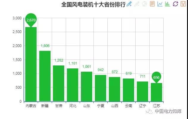 截止2017年底,全國(guó)十大風(fēng)電裝機(jī)省份分別是:內(nèi)蒙古2670萬(wàn)千瓦、新疆1806萬(wàn)千瓦、甘肅1282萬(wàn)千瓦、河北1181萬(wàn)千瓦、山東1061萬(wàn)千瓦、寧夏942萬(wàn)千瓦、山西872萬(wàn)千瓦、云南819萬(wàn)千瓦、遼寧711萬(wàn)千瓦、江蘇656萬(wàn)千瓦。