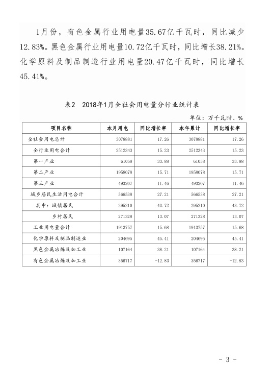 2018年1月,全省全社會用電量307.89億千瓦時,同比增長17。26%。全省發(fā)電量268.7億千瓦時,同比增長16.49%。以下為具體數(shù)據(jù):