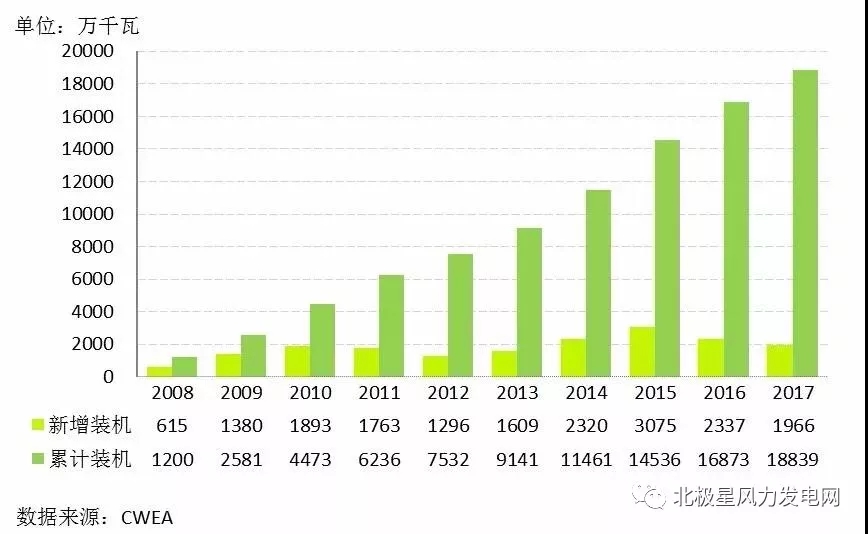 “千呼萬喚始出來”。在滿城漸飛絮的4月,MAKE、中國風(fēng)能協(xié)會相繼公布了2017中國風(fēng)電整機(jī)商排名及市場裝機(jī)情況。CWEA權(quán)威數(shù)據(jù)顯示,2017,全國(除港、澳、臺地區(qū)外)新增風(fēng)電裝機(jī)1966萬千瓦,同比下降15.9%;MAKE 公布的數(shù)據(jù)顯示2017全年新增風(fēng)電裝機(jī)1880萬千瓦,雖具體數(shù)據(jù)略有不同,但市場總體趨勢相同:從2015年風(fēng)電新增裝機(jī)首次突破3000萬千瓦大關(guān),到2016年的2337萬千瓦,再滑落至2017年的1966萬千瓦,增速放緩明顯,多家證券公司分析認(rèn)為2018年中國風(fēng)電將觸底反彈,產(chǎn)業(yè)復(fù)蘇。
