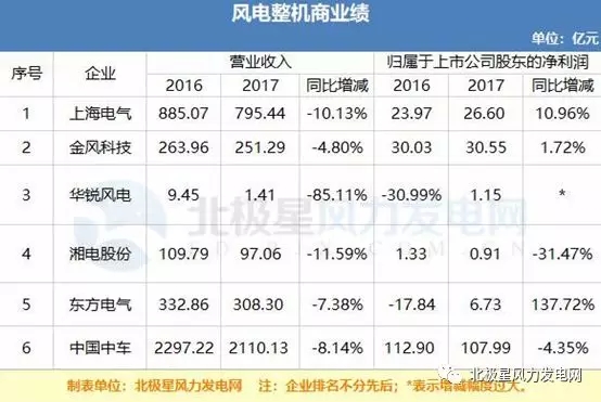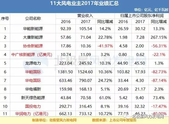 截至發(fā)文日,除去未發(fā)布正式業(yè)績報告的國電電力,北極星此次共整理了2017年11家上市風(fēng)電開發(fā)商和6家風(fēng)電整機(jī)商的相關(guān)業(yè)績報告。