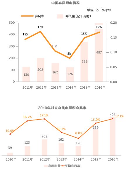 棄風限電是我國風電行業(yè)難以克服的一塊沉疴舊疾,也是一直困擾我國風電發(fā)展的核心問題。2015年,我國棄風限電問題反彈,并有進一步惡化之勢。數(shù)據(jù)顯示,2016年全年風電棄風電量497億千瓦時,同比增加158億千瓦時;平均棄風率17%,同比上升2個百分點。按平均電價0.5元/千瓦時計算,2016年損失電量收益近250億元。