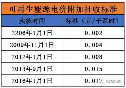自2006年1月1日開始在電價(jià)中加入0.002元的電價(jià)附加開始,國(guó)家分別在2009年、2013年和2016年三次對(duì)其進(jìn)行了調(diào)整,數(shù)額逐次遞增變成了0.019元。