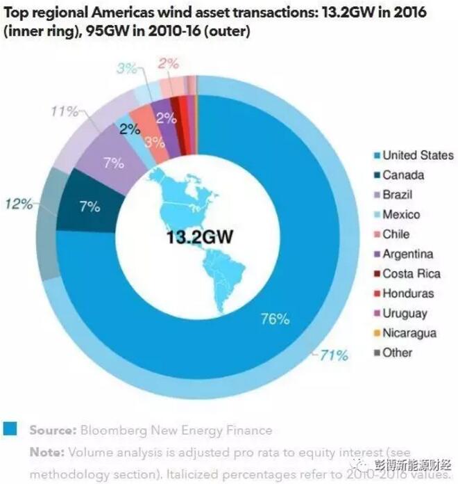 在2016年底,美洲共有148GW的陸上風(fēng)電裝機(jī)容量。根據(jù)公開渠道顯示,從2010年來(lái),至少有33%/49.6GW的容量有經(jīng)歷轉(zhuǎn)手。當(dāng)然其中也有經(jīng)歷轉(zhuǎn)手但暫無(wú)公開信息的項(xiàng)目數(shù)據(jù)。