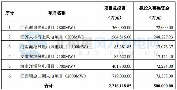 華能?chē)?guó)際近日稱(chēng)擬通過(guò)非公開(kāi)發(fā)行 A 股股票的方式募集資金總額不超過(guò)50億元(500,000 萬(wàn)元),扣除發(fā)行費(fèi)用后用于投向廣東謝崗燃機(jī)項(xiàng)目、江蘇大豐海上風(fēng)電項(xiàng)目、河南澠池鳳凰山風(fēng)電項(xiàng)目、安徽龍池風(fēng)電項(xiàng)目、海南洋浦熱電項(xiàng)目、江西瑞金二期火電項(xiàng)目。