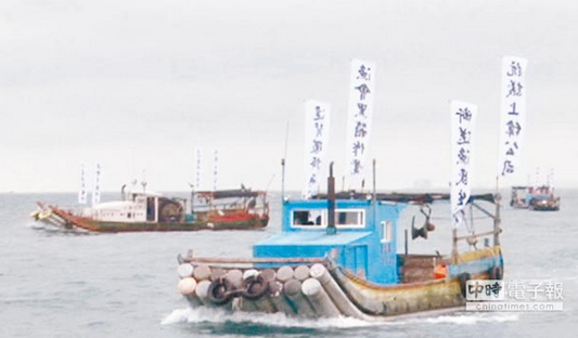 苗栗南龍漁會許多漁民在上緯公司設(shè)置風力發(fā)電機組過程中,多次表達反對意見,并在漁船出海掛白布條抗議。(陳慶居翻攝)圖片來源:臺灣《中時電子報》