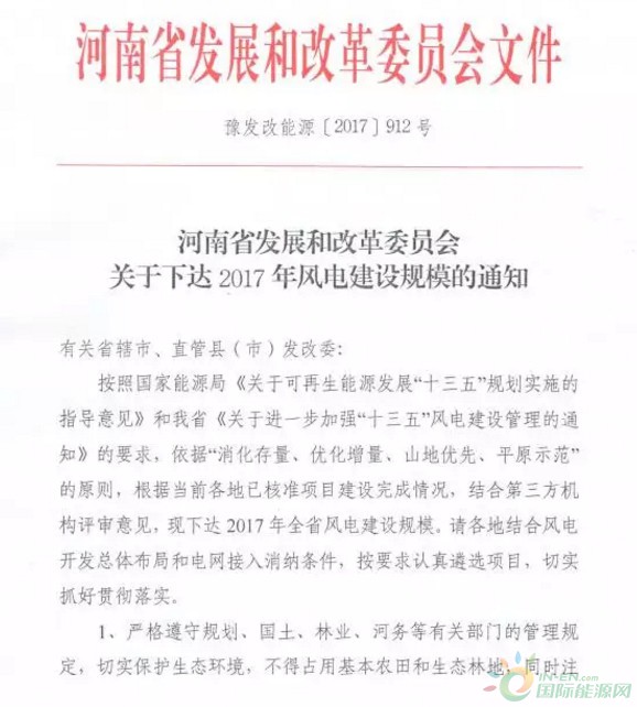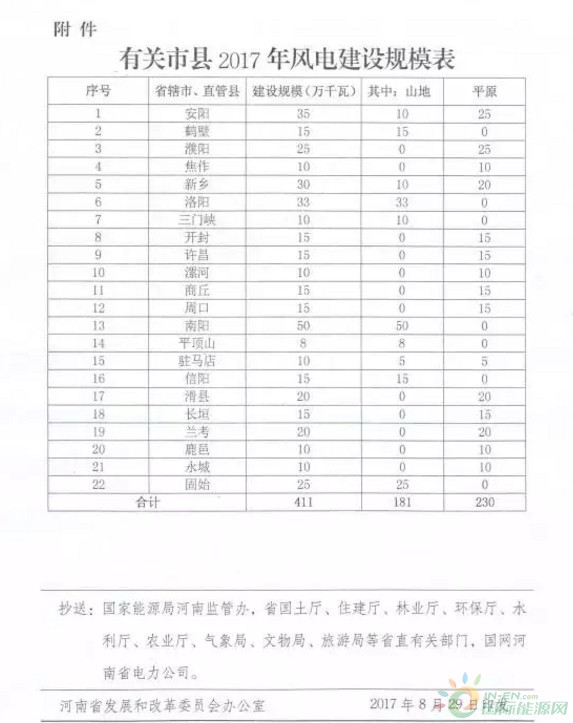 近期,河南省發(fā)改委下發(fā)了《關(guān)于下達(dá)2017年風(fēng)電建設(shè)規(guī)模的通知》。通知顯示,河南省2017年風(fēng)電建設(shè)規(guī)模指標(biāo)共計(jì)411萬千瓦,其中山地風(fēng)電181萬千瓦,平原風(fēng)電230萬千瓦。以下為原文件: