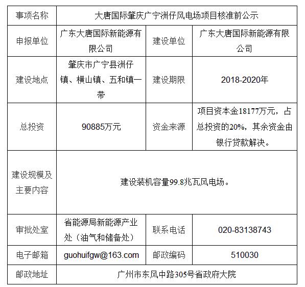 廣東發(fā)改委近日核準了大唐國際肇慶廣寧洲仔風電場項目。該項目建設規(guī)模為99 8兆瓦,總投資90885萬元。以下為具體文件:本公示的期限為 2017 8 30 至 2017 9 5。公民、法人和其他經(jīng)濟組織在公示期限屆滿后五個