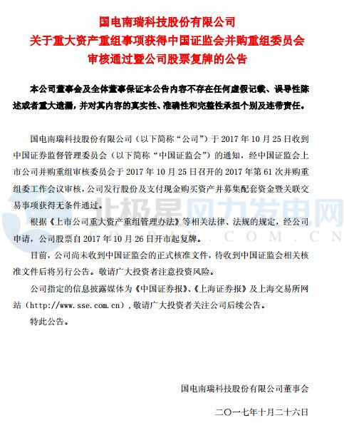 國(guó)電南瑞于10 月25 日收到中國(guó)證券監(jiān)督管理委員會(huì)的通知,其發(fā)行股份及支付現(xiàn)金購買資產(chǎn)并募集配套資金暨關(guān)聯(lián)交易事項(xiàng)獲得無條件通過。經(jīng)公司申請(qǐng),國(guó)電南瑞股票自 2017 年 10 月 26 日開市起復(fù)牌。目前