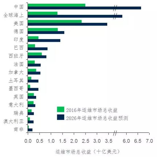 從下圖1可見,歐洲運(yùn)維市場仍為2016年市場價值最為集中的區(qū)域,風(fēng)機(jī)吊裝歷史悠久、運(yùn)維成本也相對較高。從下圖2可見,中國市場大量的吊裝項(xiàng)目將促使中國登頂2026年運(yùn)維市場收益之最,約美元67億。未來十年,美國、德國、印度、巴西與西班牙市場也將憑借大量的吊裝風(fēng)機(jī)體量成為全球最具運(yùn)維市場機(jī)遇與價值的區(qū)域。