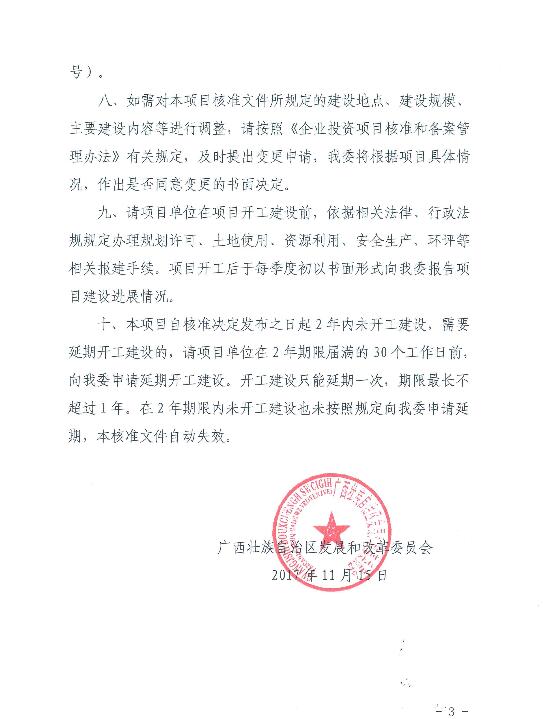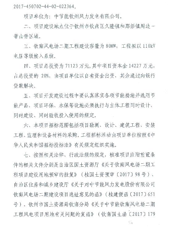 近日廣西壯族自治區(qū)發(fā)改委核準(zhǔn)了欽南風(fēng)電場二期工程,項目單位為中節(jié)能欽州風(fēng)力發(fā)電有限公司,項目建設(shè)地點位于欽州市欽南區(qū),建設(shè)容量為80MW,總投資71123萬元。以下為批復(fù)原文: