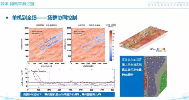 “然而我們很快意識(shí)到,單臺(tái)風(fēng)機(jī)的最優(yōu)控制可能并不代表全場(chǎng)最優(yōu)控制,因此又提出了場(chǎng)群控制的方法,通過(guò)風(fēng)機(jī)之間的信息共享和協(xié)同作用實(shí)現(xiàn)全場(chǎng)發(fā)電量的最大化。”張軒說(shuō)。