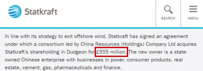 據(jù)股權(quán)出讓方Statkraf,初步協(xié)議收購金額為5.55億英鎊