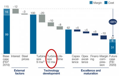 相比陸上風(fēng)電,海上風(fēng)電施工成本高,打樁和基礎(chǔ)建設(shè)需要更多物料,海上的惡劣天氣條件也增加了安裝和維護(hù)開支。同時(shí),在接入內(nèi)陸輸電網(wǎng)絡(luò)時(shí),海上風(fēng)電項(xiàng)目還需要使用昂貴的連接器。據(jù)麥肯錫,2016年海上風(fēng)電的平準(zhǔn)化成本(LCOE) 約為120到130歐元/MWh,超過當(dāng)?shù)仃懮巷L(fēng)電40%,光伏20%。