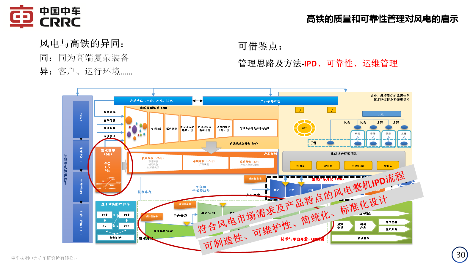 為提升風電機組可靠性,中車株洲所目前在風電機組設(shè)計中也大量引入高鐵理念。包括基于風電機組產(chǎn)品特點搭建相適應(yīng)的IPD流程,推行風電機組標準化、模塊化設(shè)計等,實現(xiàn)新產(chǎn)品開發(fā)效率提升58%,新產(chǎn)品樣機及批量質(zhì)量也大幅提升(停機故障次數(shù)大幅下降,甚至為0)。
