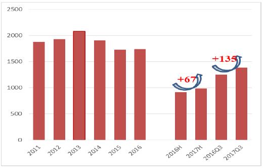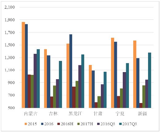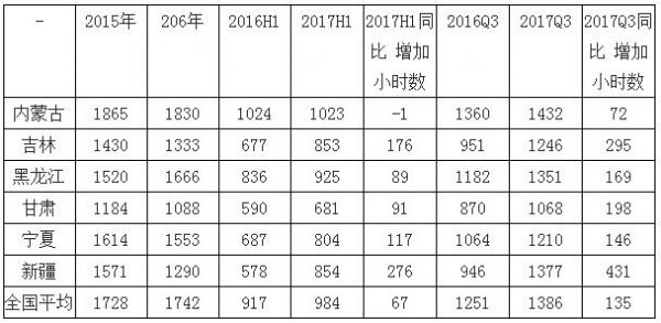 六省利用小時數(shù)全線大幅度改善。2017年上半年,全國風(fēng)電平均小時數(shù)984小時,同比增加67小時;前三季度,全國風(fēng)電平均小時數(shù)1386小時,同比增加135小時。六省中,除內(nèi)蒙古外,前三季度同比增加的小時數(shù)均遠優(yōu)于全國平均水平。但內(nèi)蒙古已經(jīng)、由上半年利用小時數(shù)同比為負改善為同比增加72小時。