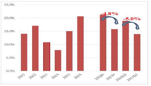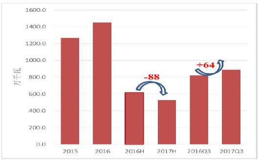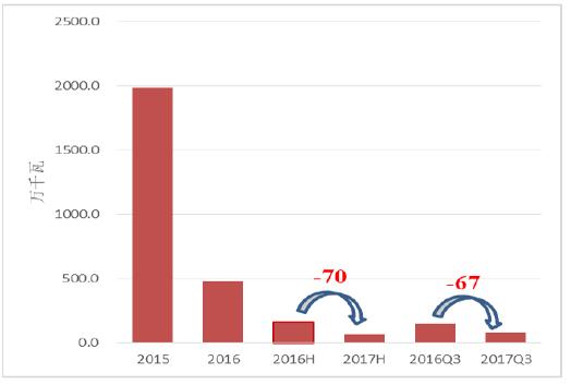 2017年上半年國內(nèi)新增并網(wǎng)容量9.7GW,其中紅六省80萬千瓦,同比下降67萬千瓦;其余省份8.88GW,同比回升64萬千瓦。2017年前三季度,內(nèi)蒙古、黑龍江三省新增并網(wǎng)容量80萬千瓦,同比2016年前三季度少并網(wǎng)67萬千瓦。由于六省要求2017年不新建風(fēng)電場,并考慮到2016年第4季度六省新增并網(wǎng)容量3.34GW,全年新并網(wǎng)容量4.81GW,相當(dāng)于2017年六省新增并網(wǎng)容量將比2016年少將近4GW??紤]到2017年并網(wǎng)項目中約2GW為去年完成吊裝,預(yù)測2017年全國風(fēng)電新增裝機較去年少4GW,約19.3GW左右。