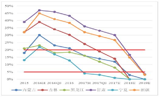 從棄風(fēng)率指標(biāo)上看,上半年全國平均棄風(fēng)率15.8%,同比降低4.8個百分點;前三季度棄風(fēng)率13.9%,同比降低5個百分點。2017年棄風(fēng)限電情況逐季好轉(zhuǎn)。六省中,甘肅棄風(fēng)率由2016年43%逐季度下降到2017年前三季度的33%,新疆棄風(fēng)率由2016年38%逐季度下降到2017年前三季度的29%,這兩個省份棄風(fēng)率最為嚴(yán)重,目前改善非常顯著、但仍然高于20%;黑龍江、吉林、內(nèi)蒙古、寧夏四省份棄風(fēng)率已經(jīng)顯著低于20%。寧夏將率先解決棄風(fēng)問題。 考慮目前六省棄風(fēng)率及改善水平,預(yù)計2018年黑龍江、吉林、寧夏將完全解決棄風(fēng)限電,內(nèi)蒙古棄風(fēng)限電率將低于5%,四省17年底18年初已經(jīng)單具備解除紅線的可能,18年底19年初勢必解除紅線;2018年甘肅、新疆兩省限電率將低于20%,2019年將低于5%,兩省解除紅線時間或許晚于其余四省份一年時間。 而實際上,內(nèi)蒙古和寧夏兩省已經(jīng)有新的風(fēng)場項目核準(zhǔn),后續(xù)再具體分析。