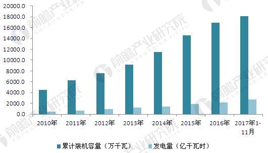 圖表3:2010-2017年中國(guó)風(fēng)電裝機(jī)容量與發(fā)電量情況(單位:萬(wàn)千瓦,億千瓦時(shí))