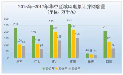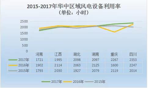 風電設(shè)備利用率上,三年來除重慶地區(qū)外,華中區(qū)域基本處于平穩(wěn)增長狀態(tài)。2017年河南、江西、湖北、湖南、重慶、四川風電設(shè)備利用率分別為1721小時、1995小時、2098小時、2097小時、2267小時、2353小時。