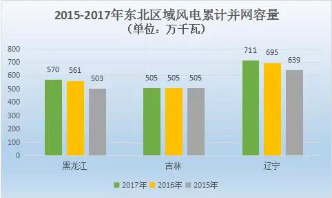 東北區(qū)域是適宜建設(shè)風電場的區(qū)域,大規(guī)模建設(shè)后,也讓近幾年棄風率較高,這也就造成了三年來東北區(qū)域新增裝機容量有限,吉林甚至出現(xiàn)了三年零增長的情況。從下圖中可以看出,黑龍江、吉林、遼寧2017年風電累計并網(wǎng)容量為570萬千瓦、505萬千瓦、711萬千瓦。
