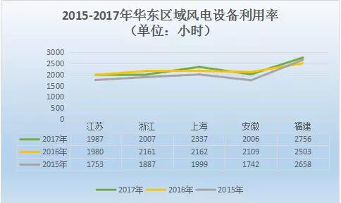 從風電設(shè)備利用率來看,2017年江蘇、浙江、上海、安徽、福建風電設(shè)備利用小時數(shù)分別為1987小時、2007小時、2337小時、2006小時、2756小時,其中江蘇、上海、福建同比增長0.4%、8.1%、10.1%。