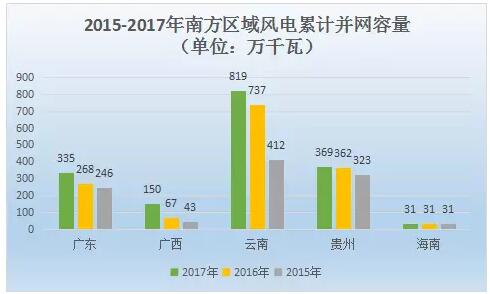 南方區(qū)域水電資源豐富,風電裝機容量相對較低,但從整體而言,南方區(qū)域的風電累計并網(wǎng)容量三年來呈上升趨勢。2017年廣東、廣西、云南、貴州、海南累計并網(wǎng)裝機容量分別為335萬千瓦、150萬千瓦、819萬千瓦、369萬千瓦、31萬千瓦。同比2016年,除海南沒有增長外,其他地區(qū)都有多增長,分別增長25.0%、123.9%、11.1%、1.9%。
