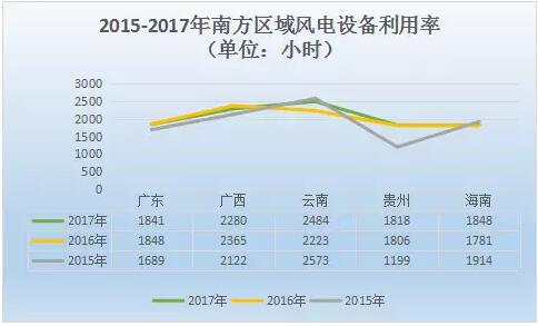 從風電設(shè)備利用率來看,2017年廣東、廣西、云南、貴州、海南風電利用小時數(shù)分別為1841小時、2280小時、2484小時、1818小時、1848小時,除廣西地區(qū)風電設(shè)備利用率有小幅下降外,其他地區(qū)依然呈緩慢提升。
