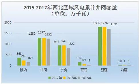 西北區(qū)域也是我國大規(guī)模風電較為集中的區(qū)域。2017年,陜西、甘肅、寧夏、青海、新疆、西藏累計裝機容量分別為363萬千瓦、1282萬千瓦、942萬千瓦、162萬千瓦、1806萬千瓦、0.8萬千瓦,其中陜西、甘肅、青海、新疆同比增長45.8%、0.4%、134.8%、1.7%。