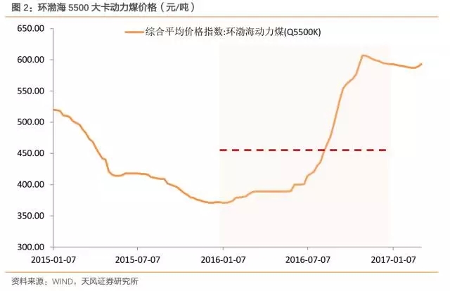 以環(huán)渤海動力煤(Q5500K)為例,2016年全年平均價格為460元/噸,中位數(shù)為408元/噸。而截至目前,環(huán)渤海動力煤的平均價格指數(shù)在593元/噸。盡管煤價從高點逐步回落已經(jīng)成為行業(yè)共識,但仍然會維持在相對高位。我們認(rèn)為,2017年的煤價中樞大概率會高于2016年全年的水平,即火電企業(yè)將面臨煤價成本的普遍抬升。