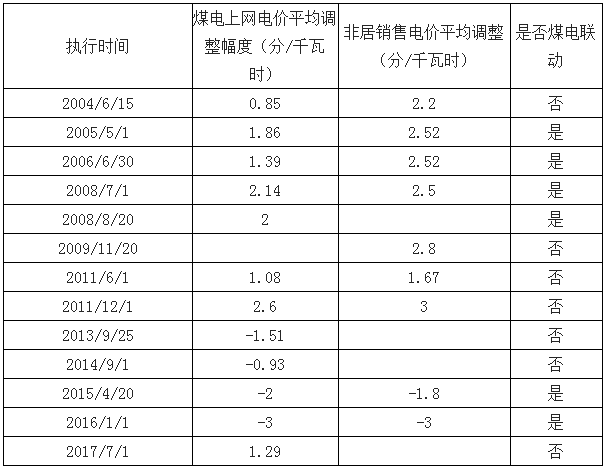 煤電機(jī)組上網(wǎng)電價(jià)及銷(xiāo)售電價(jià)調(diào)整歷史