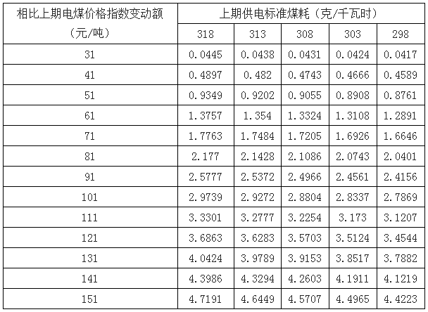 C△:上期燃煤發(fā)電企業(yè)電煤(電煤熱值為5000大卡/千克)價(jià)格變動(dòng)值,具體計(jì)算方法見(jiàn)下表,單位為“元/噸”。Ci:上期供電標(biāo)準(zhǔn)煤耗(標(biāo)準(zhǔn)煤熱值為7000大卡/千克),以中國(guó)電力企業(yè)聯(lián)合會(huì)向社會(huì)公布的各省燃煤發(fā)電企業(yè)上期平均供電標(biāo)準(zhǔn)煤耗為準(zhǔn),單位為“克/千瓦時(shí)”。