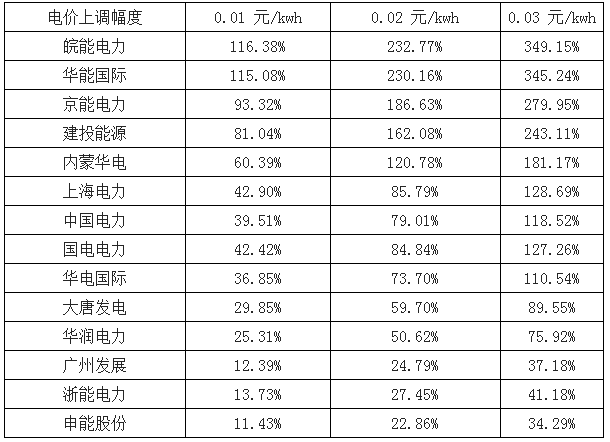 電價(jià)上調(diào)業(yè)績(jī)彈性測(cè)算