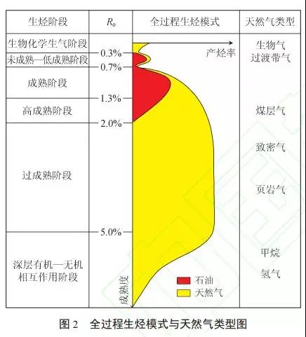 ③非常規(guī)連續(xù)型天然氣聚集理論,抓住了非常規(guī)天然氣分布的標志特征,為頁巖氣等非常規(guī)天然氣的工業(yè)起步提供了有力的依據(jù)。此外,前陸沖斷帶構造氣藏、深層海相碳酸鹽巖氣藏、大面積巖性氣藏、全過程生烴(圖2)等重要理論,高精度地震勘探、高效安全鉆完井、儲層壓裂改造增產等核心技術,為推動中國天然氣儲量快速增長均發(fā)揮了重要作用。目前全國共發(fā)現(xiàn)氣田509個,累計探明天然氣儲量13.4×10^12m^3,已建成長慶、塔里木、四川3個儲量超過1×10^12m^3的大氣區(qū),為中國天然氣快速發(fā)展奠定了基礎。