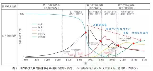 世界能源發(fā)展在木柴向煤炭、煤炭向油氣的轉化已經(jīng)基本完成之后,將經(jīng)歷油氣向新能源的第三次重大轉換(圖1)。天然氣在實現(xiàn)第三次重大轉換的過程中發(fā)揮著重要的橋梁作用,世界能源已形成石油、天然氣、煤炭、新能源“四分天下”的新格局。社會文明發(fā)展驅動能源需求向清潔、高效和便捷方向發(fā)展,科學技術進步驅動能源生產變革,最終實現(xiàn)人類文明與能源需求的平衡發(fā)展。