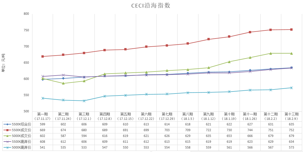 今日,中電聯(lián)公布中國沿海電煤采購價格指數(shù)(CECI沿海指數(shù))第13期數(shù)據(jù),本期數(shù)據(jù)相比上期均有不同程度的增長,現(xiàn)整理第1期至第13期數(shù)據(jù)如下: