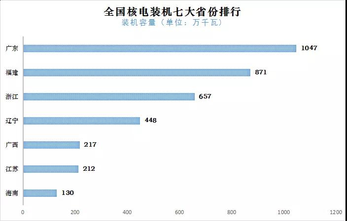 截止2017年底全國七大核電裝機省份