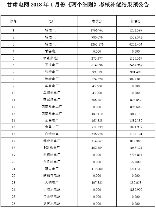 甘肅電網(wǎng)2018年1月份“兩個細則”考核補償結(jié)果預(yù)公告