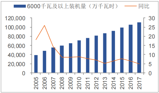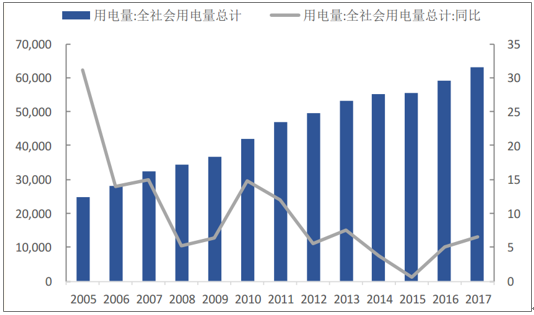 2011年之前,我國(guó)用電量增速較快,除2008年和2009年均保持在10%以上增速,隨著我國(guó)進(jìn)入經(jīng)濟(jì)轉(zhuǎn)型時(shí)期,從2012年開(kāi)始,全社會(huì)用電量增速持續(xù)下滑,2015年增速更是下滑至低點(diǎn)0.5%。17年,供給側(cè)改革推動(dòng)第二產(chǎn)業(yè)(占七成用電量)企業(yè)盈利能力增強(qiáng),疊加夏季高溫及煤改電政策,共同拉動(dòng)17年全社會(huì)用電量增速回升至6.6%。然而,從長(zhǎng)期來(lái)看,中國(guó)GDP增速步入新常態(tài),全社會(huì)用電量增長(zhǎng)放緩是大趨勢(shì),預(yù)計(jì)18年全社會(huì)用電量同比增速在4.5%~5.5%之間。