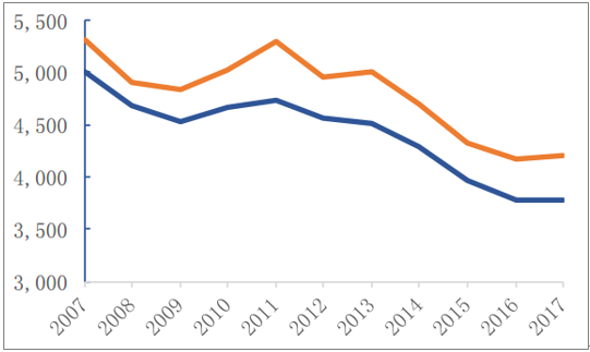 同低增速的全社會(huì)用電量和火電發(fā)電量相比,2017年以前,火電的裝機(jī)量增速一直保持在6%-9%之間,供應(yīng)量增速明顯高于需求水平,導(dǎo)致火力發(fā)電設(shè)備平均利用小時(shí)逐年降低。2016年火電設(shè)備平均利用小時(shí)為4165小時(shí),同比降低164個(gè)小時(shí)創(chuàng)下新低,2017年也僅同比增加1小時(shí),火電設(shè)備的利用率持續(xù)低迷,反映電力供需格局仍然寬松。