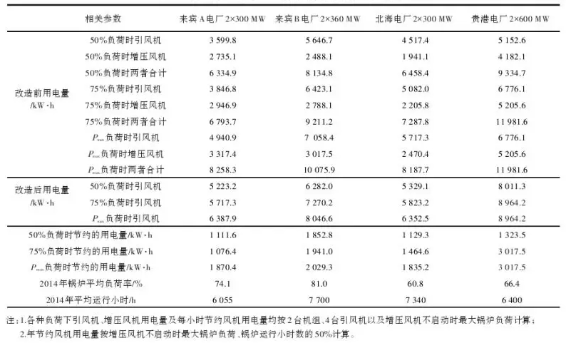 由表2數(shù)據(jù)和式(1)即可計(jì)算改造前引風(fēng)機(jī)、增壓風(fēng)機(jī)的用電量以及改造后增壓風(fēng)機(jī)不啟動(dòng)時(shí)引風(fēng)機(jī)的用電量,結(jié)果見表3。