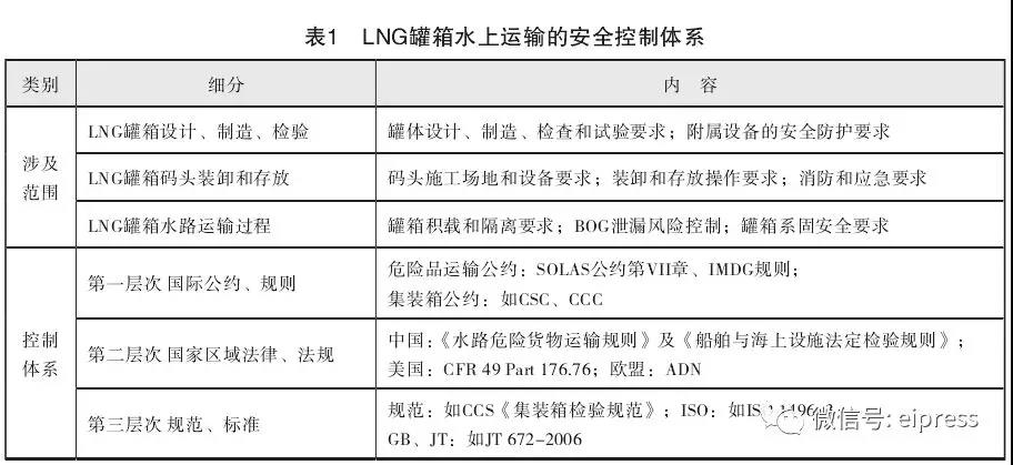 所以,該控制體系居于核心地位的是國(guó)際公約規(guī)則,其他層次均為該層次的衍生和細(xì)化。表 1 是 LNG 罐箱水上運(yùn)輸安全控制體系的主要分類和內(nèi)容。