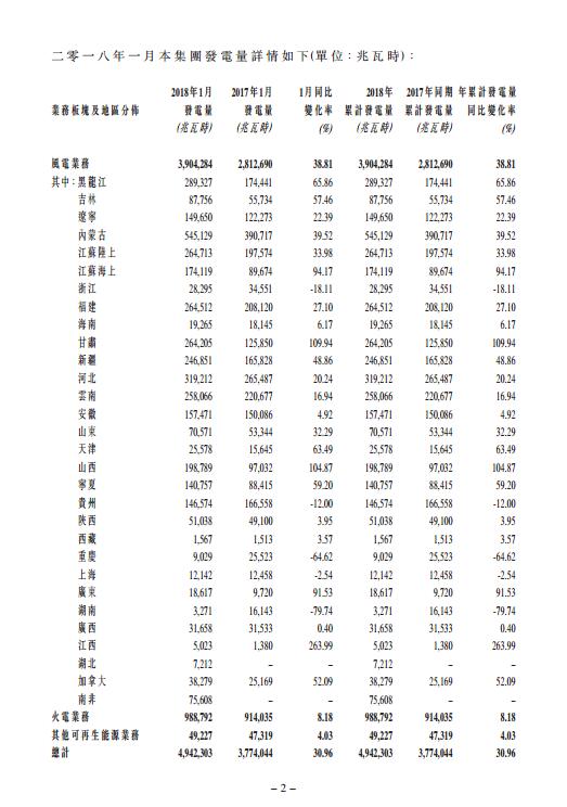龍?jiān)措娏?00916)發(fā)布公告,2018年1月,該集團(tuán)按合并報(bào)表口徑完成發(fā)電量494 2萬(wàn)兆瓦時(shí),較2017年同比增加30 96%。其中,風(fēng)電增加38 81%,火