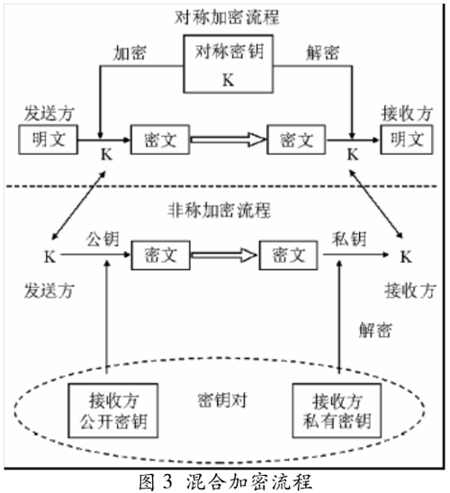 混合加密技術不是一種單一的加密技術,而是一個結合體,是上述兩種數據加密技術相互結合的產物。通信雙方的通信過程分為兩個部分,雙方先利用非對稱加密技術傳送本次通信所用的對稱密鑰,然后再用對稱加密技術加密傳送文件?;旌霞用芰鞒倘鐖D3所示。