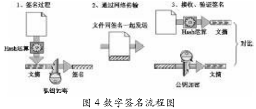 所謂”數字簽名”就是通過某種密碼運算生成一系列符號及代碼組成電子密碼進行簽名。數字簽名的概念由WhitfiedDiffie和MaitinHellman于1976年最先提出,目的是使簽名者對電子文件也可以進行簽名并且無法否認,驗證者無法篡改文件。數字簽名由簽名算法和驗證算法構成,數字簽名如圖4所示。