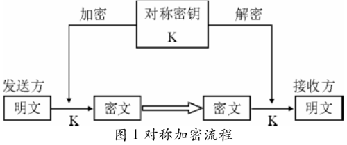 對稱加密技術(shù)由于雙方擁有相同的密鑰,具有易于實現(xiàn)和速度快的優(yōu)點,所以廣泛應(yīng)用于通信和存儲數(shù)據(jù)文件加密和解密。對稱加密技術(shù)的安全性依賴于密鑰,所以密鑰的保密性對通信安全至關(guān)重要。對稱加密流程如圖1所示。