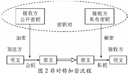 這種技術(shù)也可以稱為公鑰加密技術(shù),加密密鑰(公鑰)可以公開,即陌生人可以得到它并用來加密信息,但只有用相應(yīng)的解密密鑰(私鑰)才能解密信息。比較著名的公鑰密碼算法有:RSA、背包密碼、McEliece密碼、Hellman、Rabin、橢圓曲線算法等等,最有影響的公鑰密碼算法是RSA,它能抵抗到日前為止已知的所有密碼攻擊。公鑰密碼的優(yōu)點是可以適應(yīng)網(wǎng)絡(luò)的開放性要求,但速度比較慢,不太適合對文件進(jìn)行加密。非對稱加密流程如圖2所示。